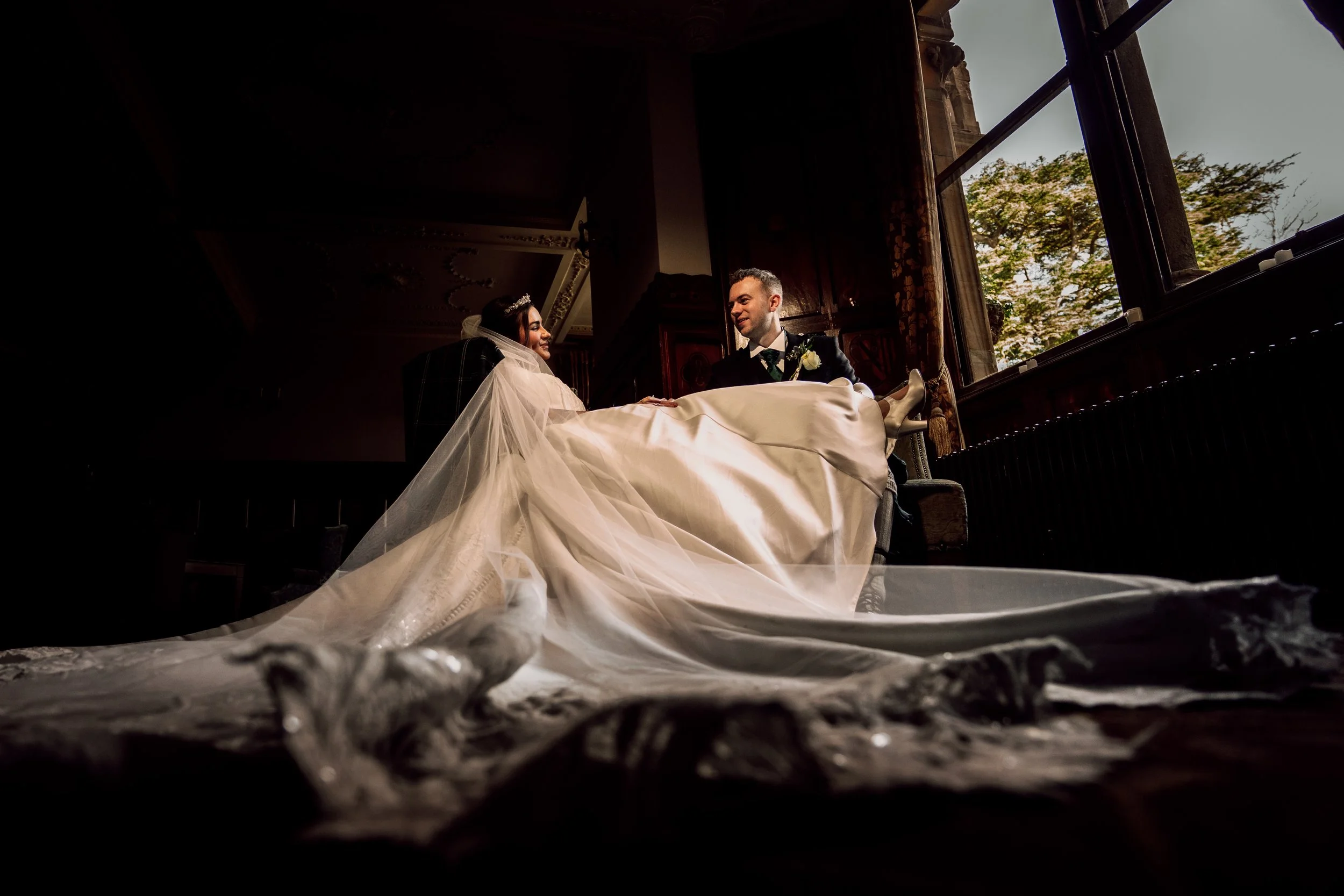 When food finished we called everyone out by their birth month to grab photos of them in groups with the bride and groom so they could build a calendar for next year….. what a great idea that was! While the band set up I took the couple for one last portrait session in the grounds at night, This was great fun because I had ideas and so did they and they all worked out great. We went to the ruins in the grounds, we went to the newest parts of the hotel and we also had some fun with the bedroom window too. The night was finnished off with a ceilidh which in my opinion if you get the right band is the best way to get your guests up and dancing and is a hell of a lot of fun to photograph.
